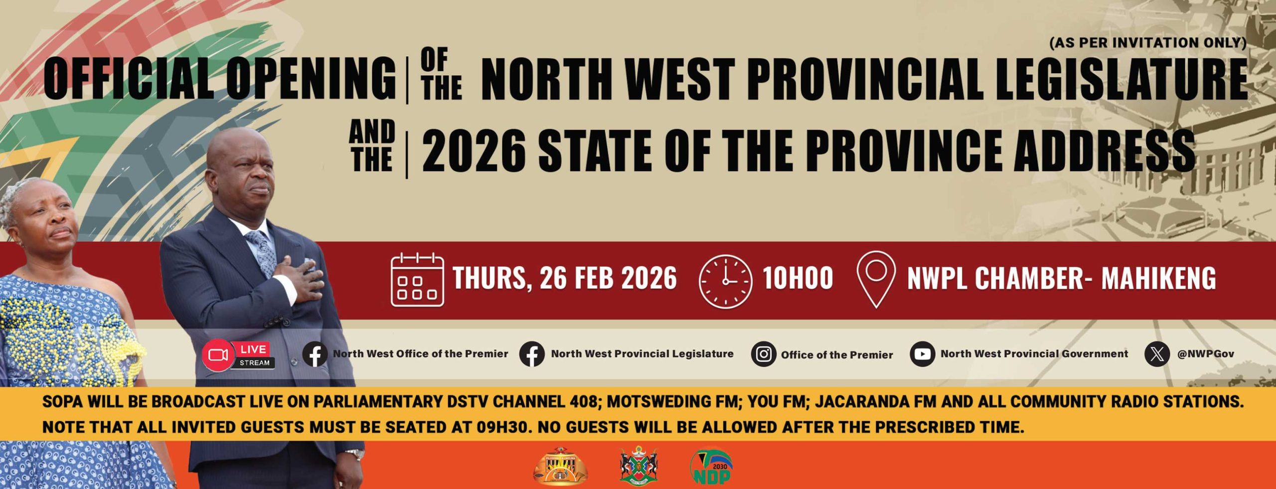 The Speaker of the North West Provincial Legislature, Hon. (Dr.) Desbo Mohono will officially open the North West Provincial Legislature wherein Premier Lazarus Mokgosi will deliver the State of the Province Address (SOPA) on Thursday, 27 February 2025 in the Legislature Chamber at 10h00.
